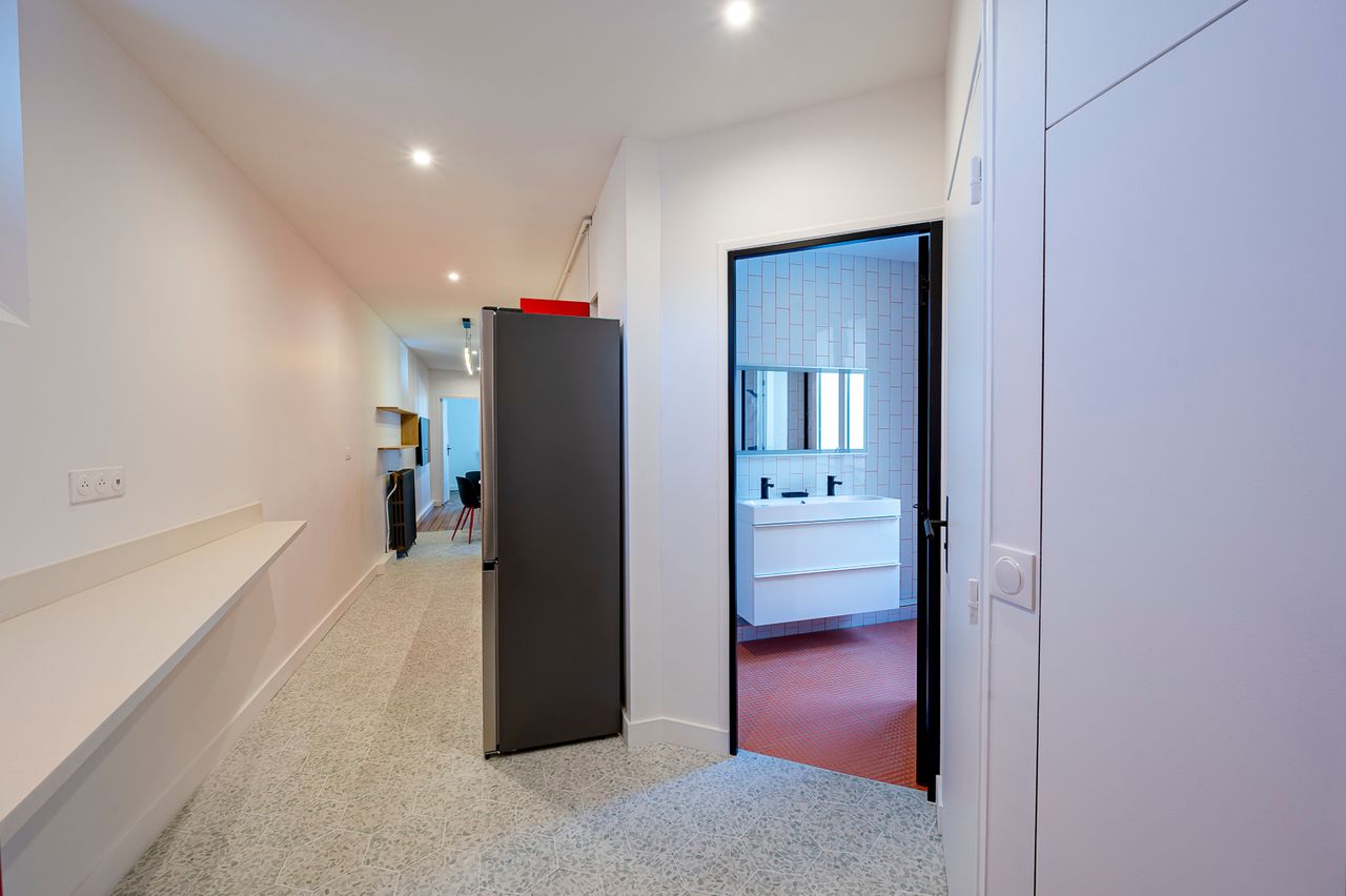 Accessible on the 5th floor (out of 6) with an elevator, this apartment, renovated by an architect, will be rented fully furnished. It will provide you with everything you need for your comfort. The kitchen is fully equipped: sink, hob, extractor hood, oven, refrigerator, freezer, microwave, dishwasher, washer-dryer, kettle, coffee machine, and plenty of storage space with dishes and utensils.